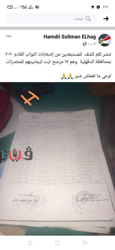 تداول كشف بأسماء ١٧ مرشحا مستبعدا من سباق البرلمان بسبب تحليل المخدرات في الدقهلية