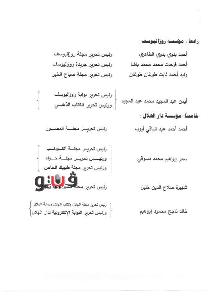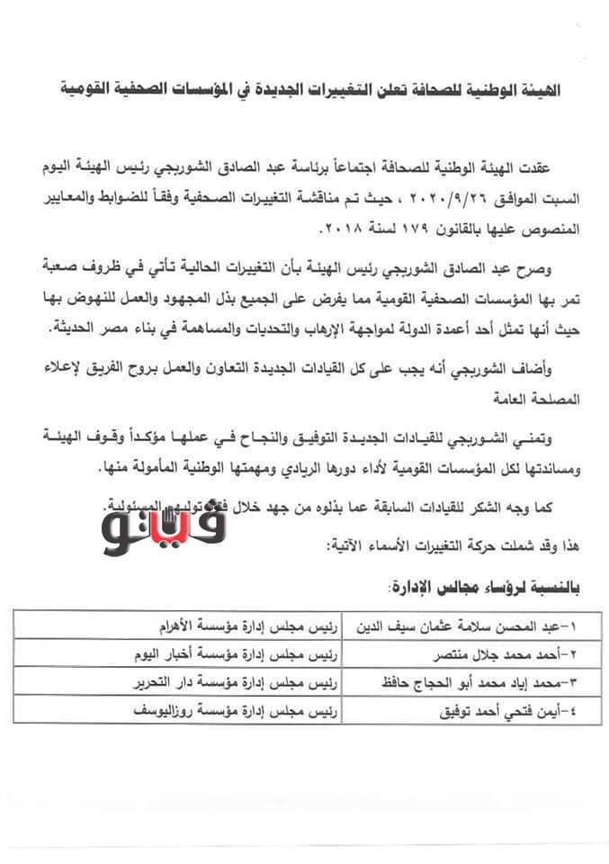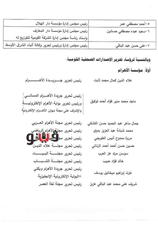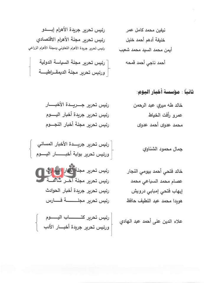 و تقرر فى الإعلان الإبقاء علي الكاتب الصحفى عبد المحسن سلامة لرئاسة مجلس إدارة مؤسسة الأهرام، وعلاء ثابت لرئاسة تحرير الأهرام، وماجد منير لرئاسة تحرير الأهرام المسائي، وخالد ميرى لرئاسة تحرير الأخبار، وأحمد باشا لروزاليوسف، وعبد الرازق توفيق للجمهورية، وأحمد أيوب لمجلة المصور.