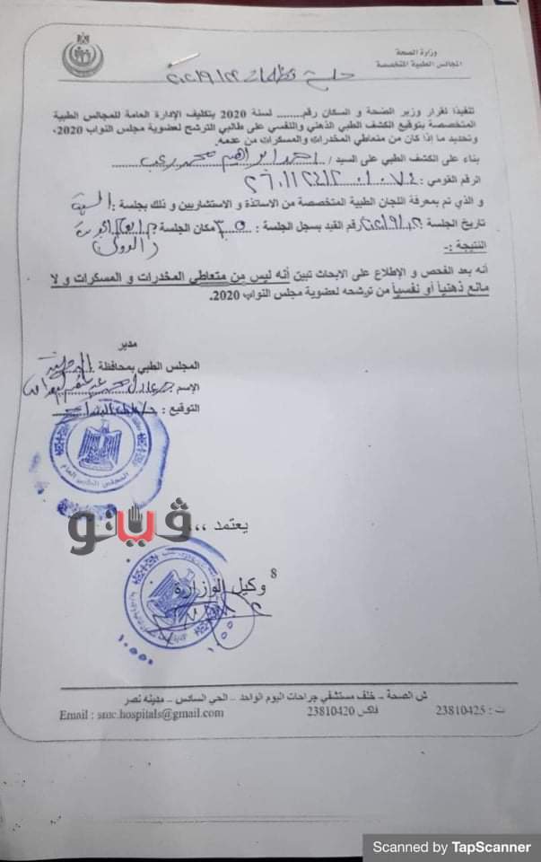جاء ذلك تنفيذا لقرار وزير الصحة والسكان رقم السنة 2020 بتكليف الإدارة العامة للمجالس الطبية المتخصصة بترفع الكشف الطبي الذهني والنفسي على طالبي الترشح لعضوية مجلس النواب 2020، وتحديد ما إذا كان من متعاطي المخدرات والمسكرات من عدمه وتبين من قرار اللجنة بناء على الكشف الطبي على "أحمد إبراهيم محمد رعب".