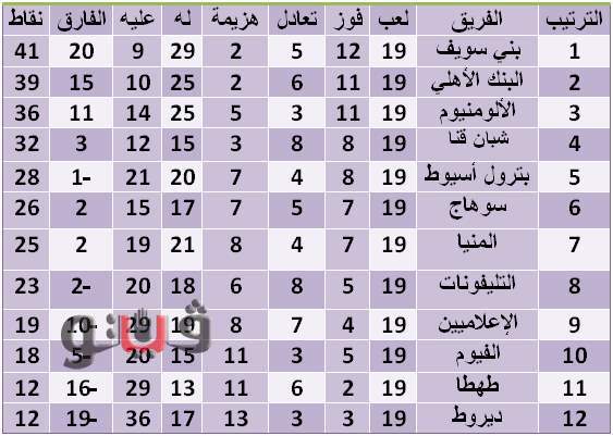 ويحتل بني سويف القمة برصيد 41 نقطة و بفارق نقطتين عن البنك الأهلي صاحب المركز الثاني برصيد 39 نقطة ، فيما يحتل الألومنيوم المركز الثالث برصيد 36 نقطة وشبان قنا رابعا برصيد 32 نقطة.