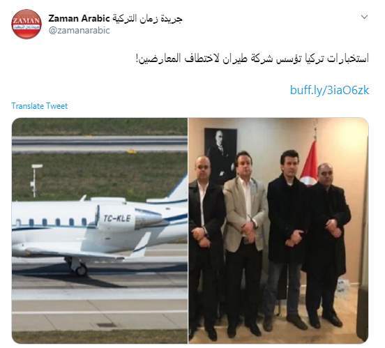 واستشهدت "زمان" التركية بموقع "نورديك مونيتر" الإخباري، الذي نشر تقريرًا عن شركة "المتحدة المساهمة للإنشاءات والسياحة والتجارة والصناعة"، رصد فيه تحركات الطائرات المدنية التي يستخدمها جهاز الاستخبارات التركي في عمليات اختطاف المعارضين خارج البلاد، مشيرًا إلى أن الشركة تمتلك سجلا ملطخا بالفضائح.
