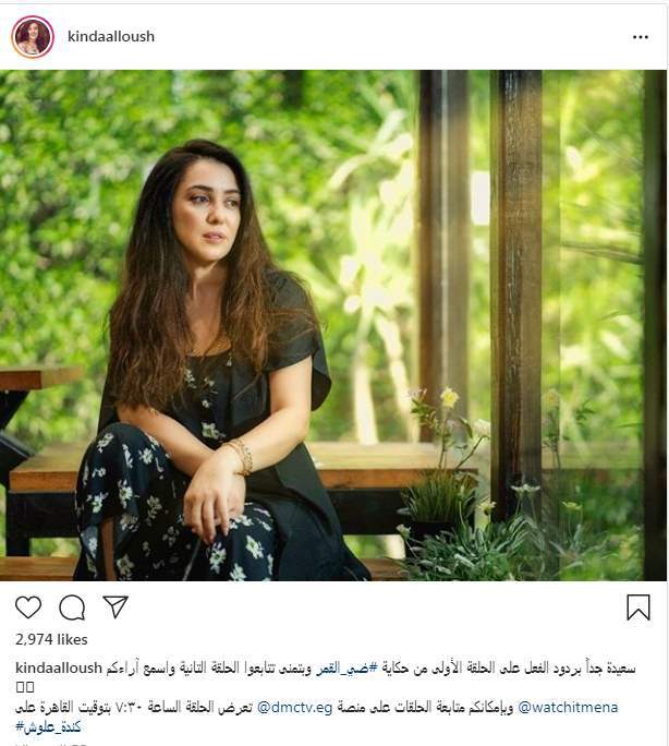 ونشرت كندة علوش صورة جديدة معلقة عليها: "سعيدة جداً بردود الفعل على الحلقة الأولى من حكاية #ضي_القمر وبتمنى تتابعوا الحلقة التانية واسمع آراءكم.. تعرض الحلقة الساعة ٧:٣٠ بتوقيت القاهرة على قناة dmcوبإمكانكم متابعة الحلقات على منصة watch it".