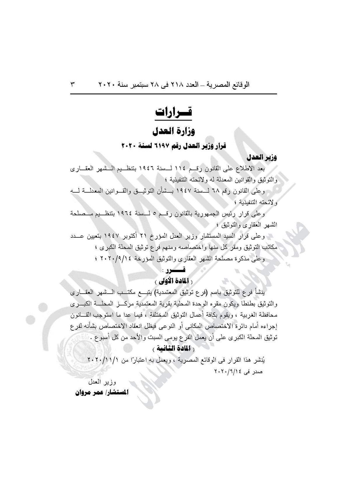 نشرت جريدة الوقائع المصرية في عددها رقم 218، الصادر في 28 سبتمبر لسنة 2020، قرار وزارة العدل رقم 6197 لسنة 2020، بشأن إنشاء فرع للتوثيق باسم (فرع توثيق المعتمدية) يتبع مكتب الشهر العقاري والتوثيق بطنطا.