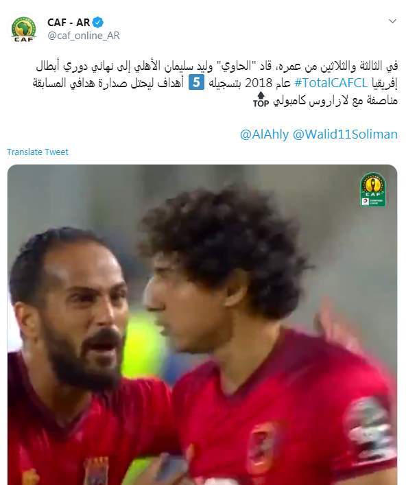 وكتب الاتحاد الإفريقى لكرة القدم "كاف" تغريدة على تويتر "في الثالثة والثلاثين من عمره، قاد "الحاوي" وليد سليمان الأهلي إلى نهائي دوري أبطال إفريقيا #TotalCAFCL عام 2018 بتسجيله 5 أهداف ليحتل صدارة هدافي المسابقة مناصفة مع لازاروس كامبولي"