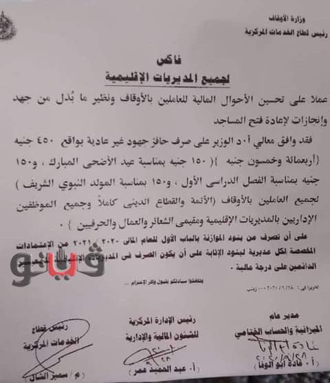قرر الدكتور محمد مختار جمعة، وزير الأوقاف صرف مكافأة للعاملين بالوزارة على طريقة 3 × 1، حيث تجمع المكافأة صرف جهود غير عادية بواقع 150 جنيه بمناسبة عيد الأضحى المبارك، و150 بمناسبة الفصل الدراسي الأول، و150 بمناسبة المولد النبوي الشريف.