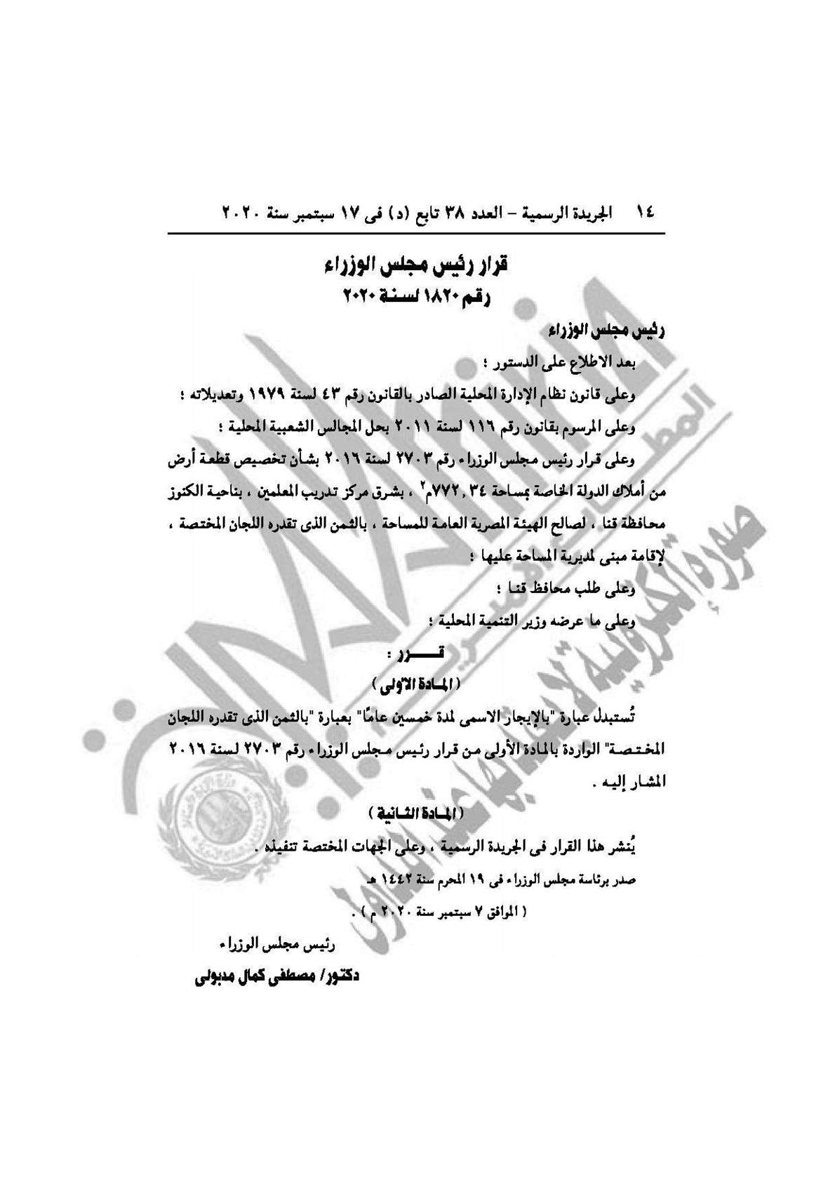 القرار رقم 1820 لسنة 2020، باستبدال عبارة "بالايجار الاسمى لمدة خمسين عاما، بعبارة بالثمن الذي الذي تقدره اللجان المختصة الواردة بالمادة الأولى من قرار رئيس مجلس الوزراء رقم 2703 لسنة 2016.