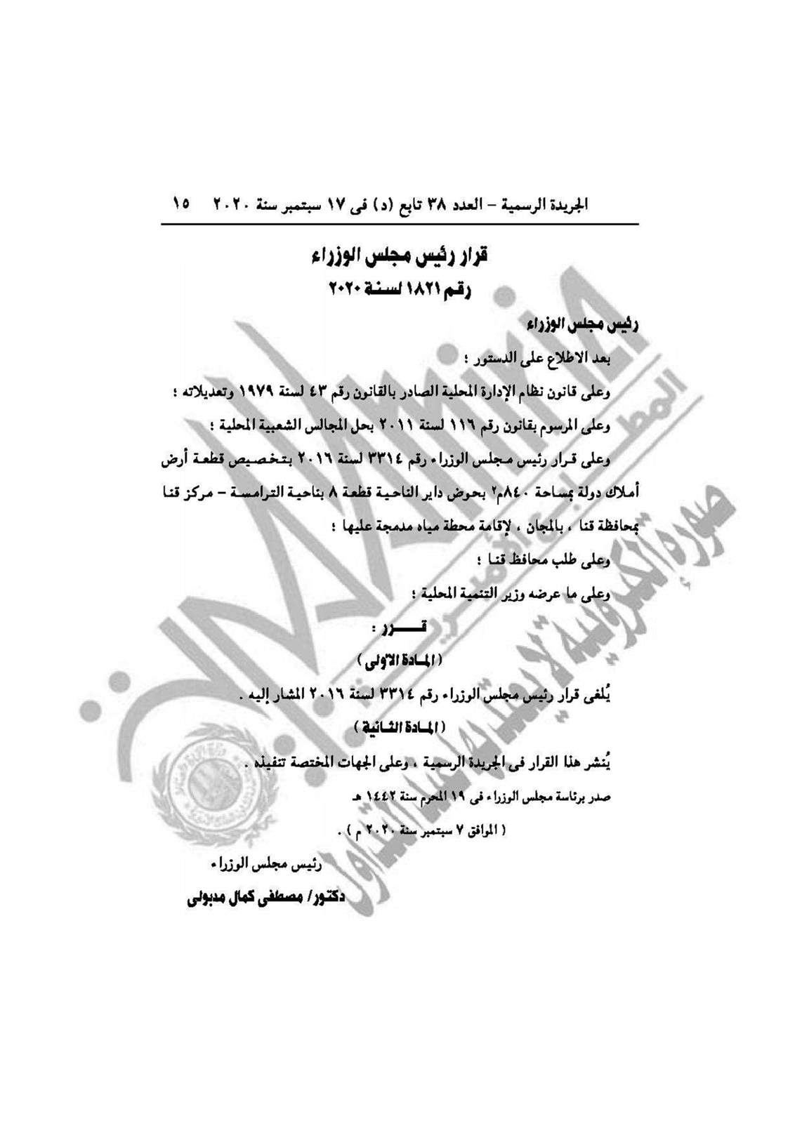 والقرار رقم 1821 لسنة 2020، بإلغاء قرار رئيس مجلس الوزراء رقم 3314 لسنة 2016.
