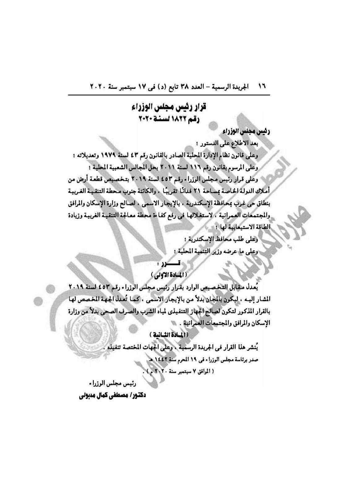 والقرار رقم 1822 لسنة 2020، بتعديل مقابل التخصيص الوارد بقرار رئيس مجلس الوزراء رقم 453 لسنة 2019، ليكون بالمجان بدلاً من الإيجار الاسمي، كما تعدل الجهة المخصص لها القرار لتكون لصالح الجهاز التنفيذي لمياه الشرب والصرف الصحى بدلا نت وزارة الإسكان والمرافق والمجتمعات العمرانية.