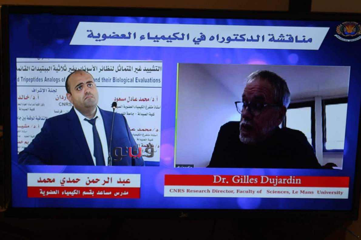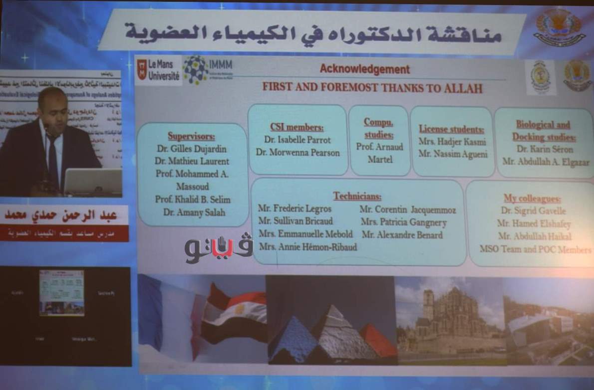 تمت المناقشة للمدرس المساعد عبد الرحمن حمدي بقسم الكيمياء العضوية الصيدلية عن طريق تقنية الفيديو كونفرانس.