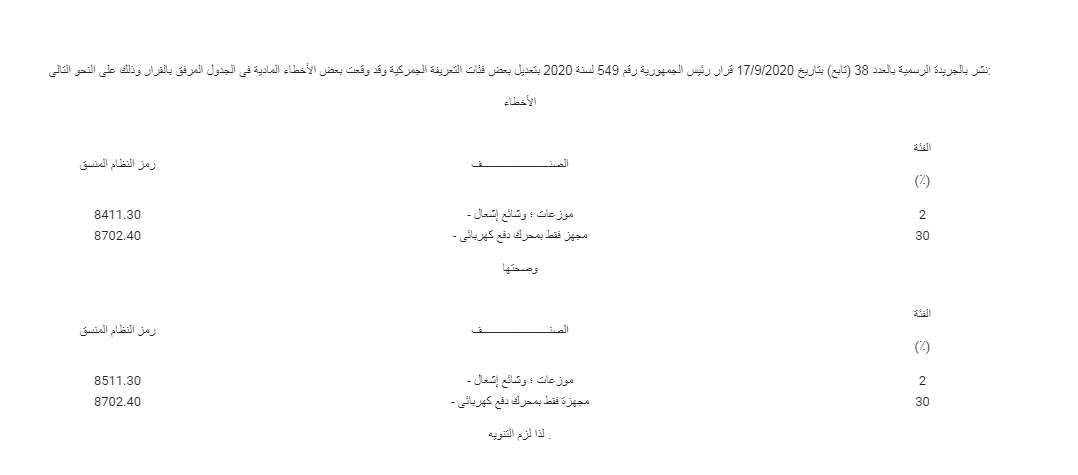 صححت الجريدة الرسمية بعض الأخطاء المادية التي نشرت بالعدد 38 (تابع) بتاريخ 17/9/2020، قرار رئيس الجمهورية رقم 549 لسنة 2020 بتعديل بعض فئات التعريفة الجمركية، ووقعت بعض الأخطاء المادية فى الجدول المرفق بالقرار