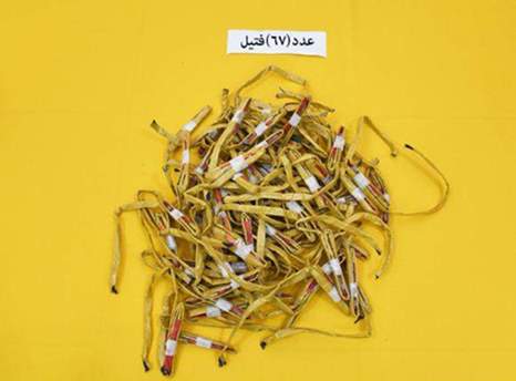 وبحسب وكالة الأنباء السعودية "واس"، ضبطت كمية من الأسلحة والمتفجرات مخبأة في موقعين، أحدهما منزل والآخر عبارة عن مزرعة، والمضبوطات كالآتي: "(9) أكواع متفجرة بحالة تشريك، (67) فتيلا متفجرا، (51) صاعقا متفجرا كهربائيا، مجموعة كبيرة من المكثفات ومحولات كهربائية ومقاومات إلكترونية تستخدم في التشريك وتصنيع المتفجرات، (5.28) كغم من البارود الناعم والخشن".