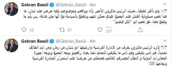 وكتب جبران باسيل تغريدة على تويتر قال فيها: "ولو تأخّر تعليقنا... حديث الرئيس ماكرون الأخير بنّاء وواقعي وموضوعي وفيه حرص على لبنان، ما عدا تعميم مسؤولية الفشل على الجميع. هيدي ممكن تنفهم وبتقطع بالسياسة مع انّها مش عادلة، بس يلّي ما بيقطع معنا، هو تعميم انو "الكل قبضوا".