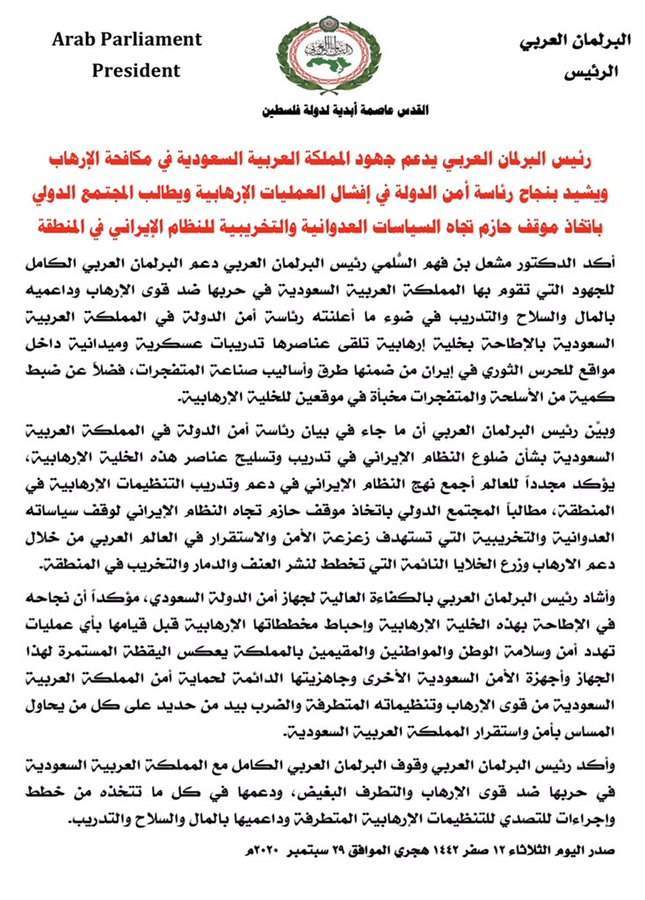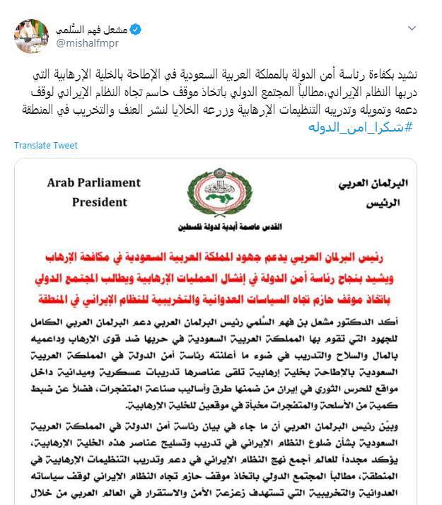 أشاد رئيس البرلمان العربي مشعل فهم السُلمي بأمن الدولة السعودي، الذي تمكن من القبض على الخلية الإرهابية التي دربها النظام الإيراني، مطالبًا المجتمع الدولي الوقوف بحسم لوقف دعم وتمويل التنظيمات الإرهابية.