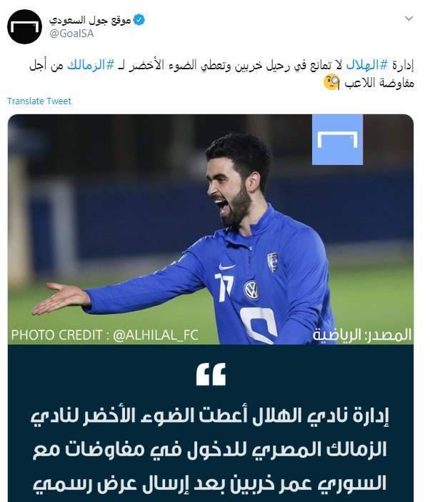 أكد موقع جول السعودي أن إدارة نادي الهلال لا تمانع من رحيل اللاعب السوري عمر خربين، ومنحت الضوء الأخضر لنادي الزمالك في التفاوض من أجل توقيع خربين للعب في النادي.