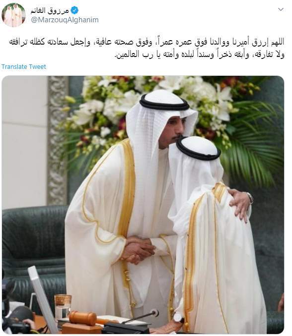 وكتب مرزوق الغانم تغريدة على تويتر: "اللهم ارزق أميرنا ووالدنا فوق عمره عمراً، وفوق صحته عافية، وإجعل سعادته كظله ترافقه ولا تفارقه، وأبقه ذخراً وسنداً لبلده وأمته يا رب العالمين".