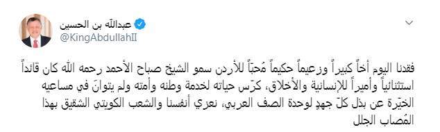 وكتب الملك عبد الله بن الحسين تغريدة على تويتر قال فيها: "فقدنا اليوم أخاً كبيراً وزعيماً حكيماً مُحبّاً للأردن سمو الشيخ صباح الأحمد رحمه الله كان قائداً استثنائياً وأميراً للإنسانية والأخلاق، كرّس حياته لخدمة وطنه وأمته ولم يتوانَ في مساعيه الخيّرة عن بذل كلّ جهدٍ لوحدة الصف العربي، نعزي أنفسنا والشعب الكويتي الشقيق بهذا المُصاب الجلل".
