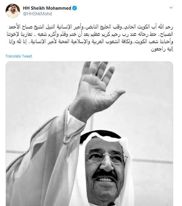 وكتب الشيخ محمد بن راشد آل مكتوم تغريدة على تويتر قال فيها: "رحم الله أب الكويت الحاني..وقلب الخليج النابض..وأمير الإنسانية النبيل الشيخ صباح الأحمد الصباح.. حط رحاله عند رب رحيم كريم عظيم بعد أن خدم وقدّم وأكرم شعبه .. تعازينا لإخوتنا وأحبابنا شعب الكويت..ولكافة الشعوب العربية والإسلامية المحبة لأمير الإنسانية.. إنا لله وإنا إليه راجعون".