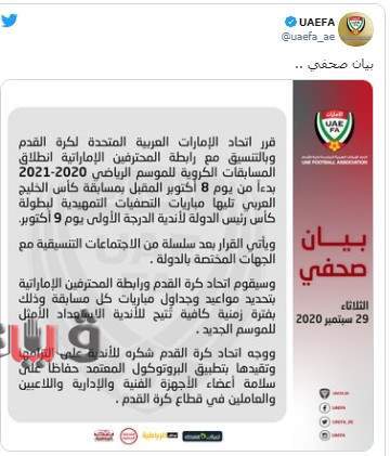 وأصدر الاتحاد الإماراتي بيانا قال فيه: ”قرر اتحاد الإمارات العربية المتحدة لكرة القدم وبالتنسيق مع رابطة المحترفين الإماراتية انطلاق المسابقات الكروية للموسم الرياضي 2020-2021 بدءا من يوم 8 أكتوبر المقبل بمسابقة كأس الخليج العربي“.