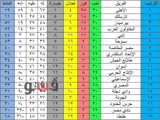 تنشر فيتو جدول ترتيب أندية الدوري المصري الممتاز، بعد إنتهاء مباريات الجولة 30 من المسابقة، والتى جاءت نتائج مبارياتها على النحو التالي :