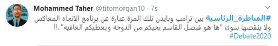 وقال أخر :إن "المناظرة بين ترامب وبايدن تلك المرة عبارة عن الاتجاه المعاكس".