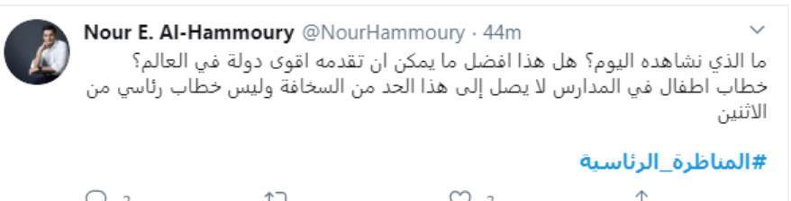 وآخر استغرب من التلاسن الحاد بين المرشحين، حيث قال :" ما الذي نشاهده اليوم؟ هل هذا أفضل ما يمكن تقديمه أقوى دولة في العالم؟، خطاب أطفال المدارس لا يصل لحد هذه السخافة وليس خطابا رئاسيا".
