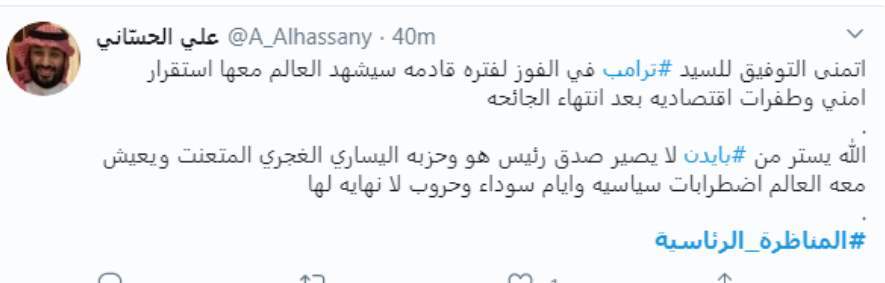 كما أعرب مغرد آخر عن دعمه للرئيس ترامب، وقال :" أتمنى التوفيق للسيد ترامب في الفوز لفترة رئاسية قادمة سيشهد فيها العالم استقرار أمني وطفرات اقتصادية بعد انتهاء الجائحة".