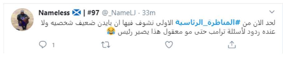 وأبدى مغردون استغرابهم من ضعف بايدن في المناظرة، وقال أحدهم :" لحد الآن من المناظرة الأولى نشوف أن بايدن ضعيف، وليس عنده ردود لأسئلة ترامب.. مو معقول يصير هذا رئيس".