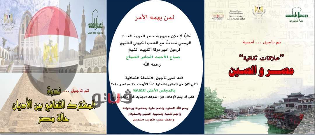 كما تم الإعلان منذ قليل عن تأجيل ندوة قطاع العلاقات الثقافية الخارجية، بالتعاون مع المجلس الأعلى للثقافة، المقرر إنعقادها مساء اليوم الأربعاء، في المعنونه بـ "مصر والصين - علاقات ثقافية".