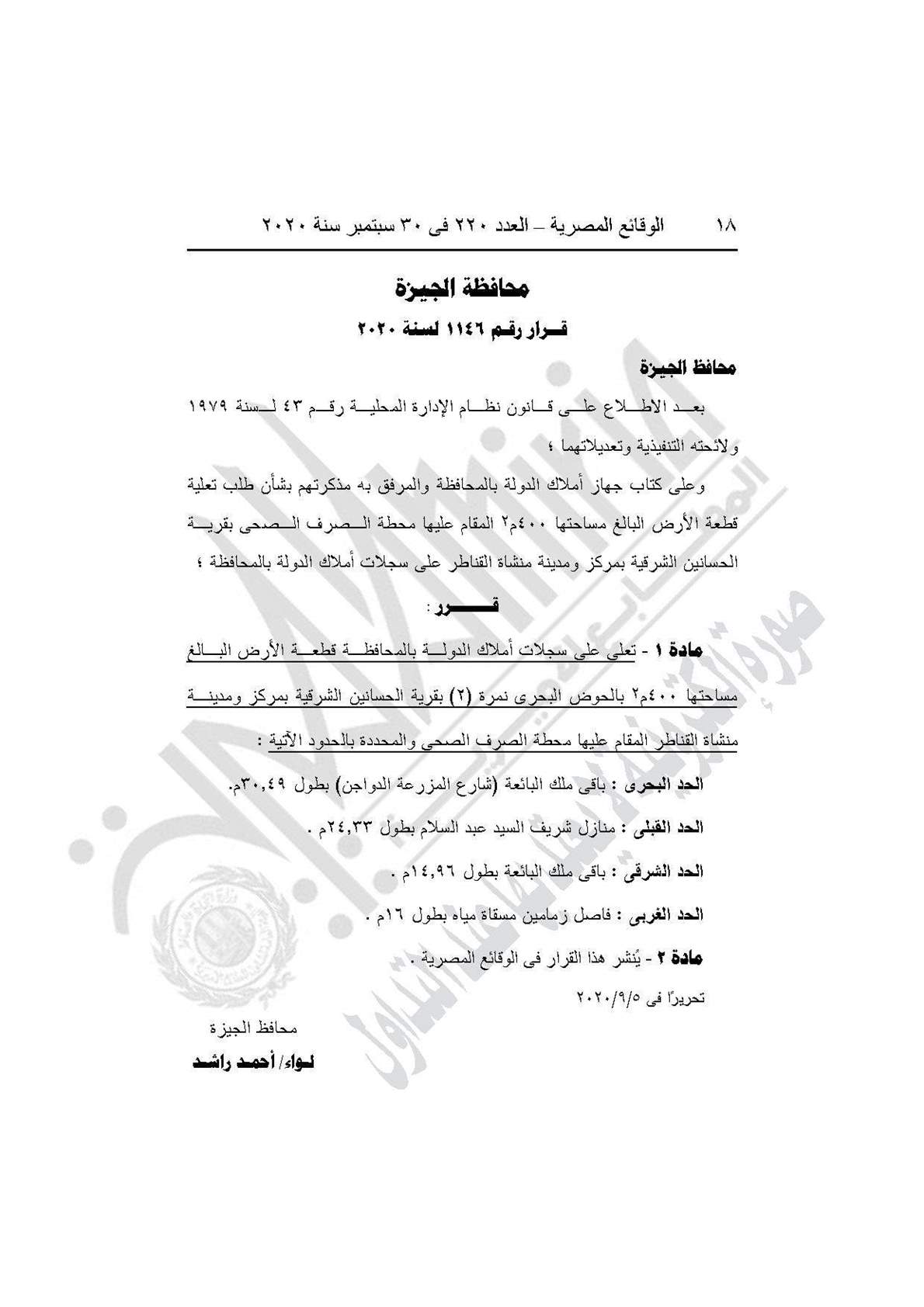 وينص القرار على التعلية على سجلات أملاك الدولة بالمحافظة قطعة الأرض البالغ مساحتها 400 متر مربع بالحوض البحري نمرة (2) بقرية الحسانين الشرقية بمركز ومدينة منشأة القناطر المقام عليها حطة الصرف الصحي.
