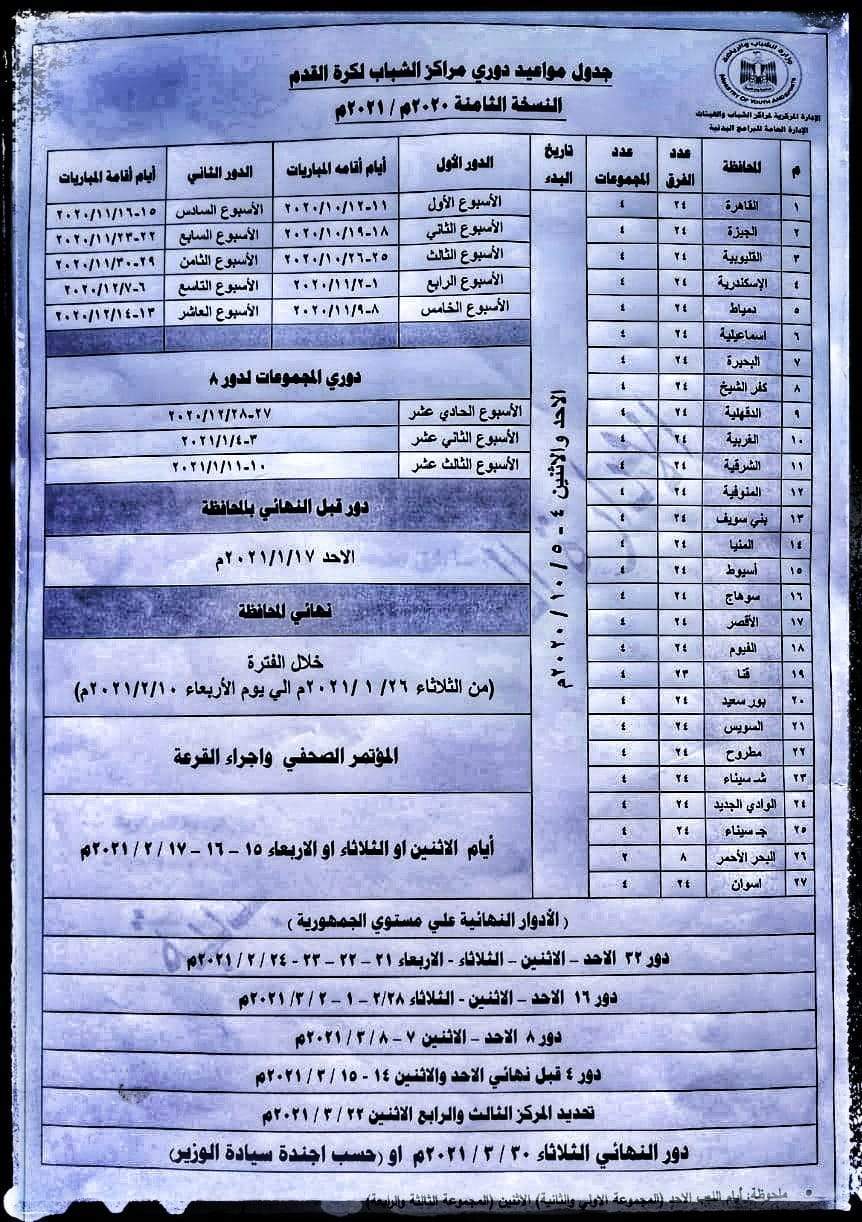 أعلنت اللجنة المنظمة لدوري مراكز الشباب بوزارة الشباب والرياضة من خلال الإدارة المركزية لمراكز الشباب والهيئات الشبابية ، جدول دوري مراكز الشباب النسخة الثامنة بالكامل من بدايته 11 أكتوبر القادم وحتي النهائي والذي يقام آخر مارس 2021 .