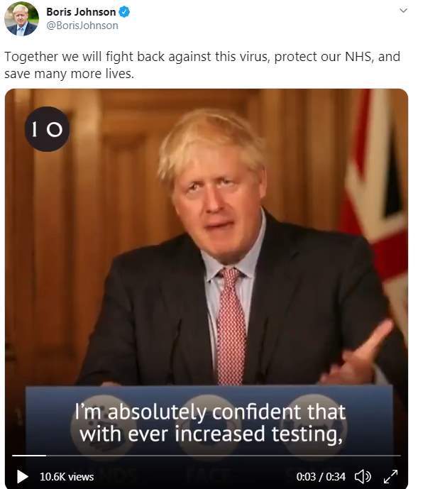 وبث بوريس جونسون مقطع فيديو يخاطب فيه البريطانيين، مؤكدًا على ضرورة الالتزام بالتباعد الاجتماعي وارتداء الكمامة لحماية الأرواح.