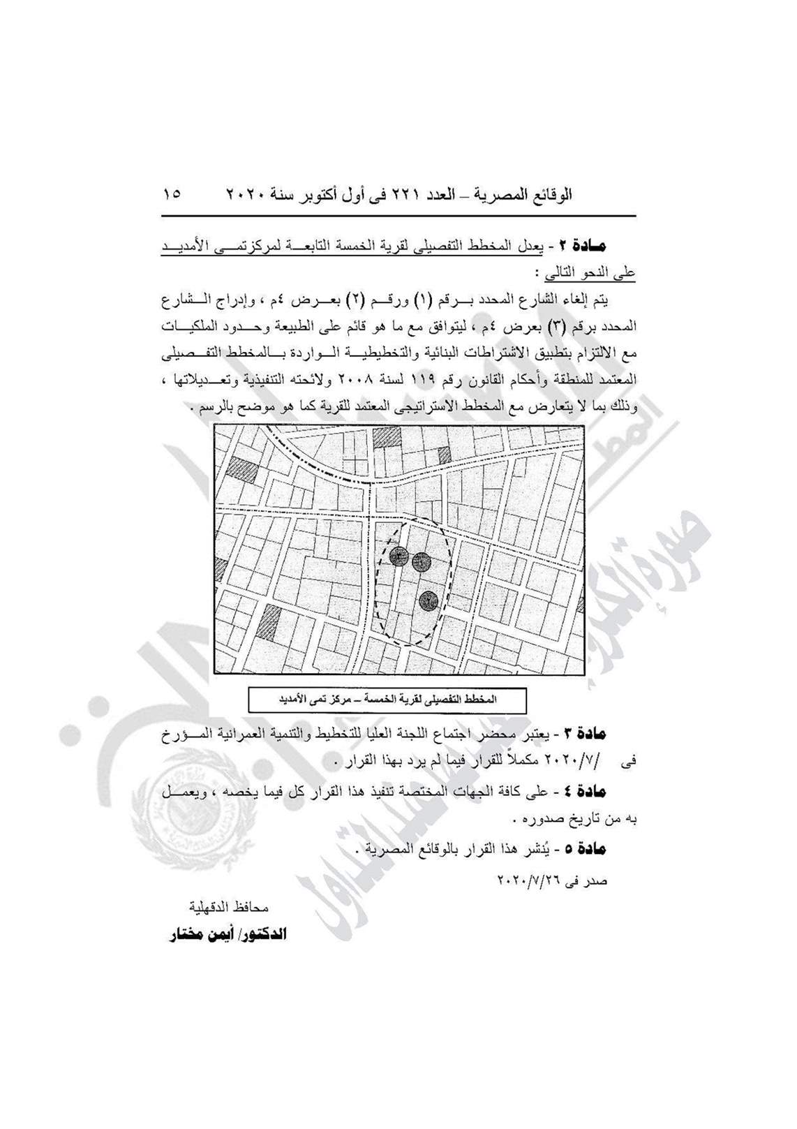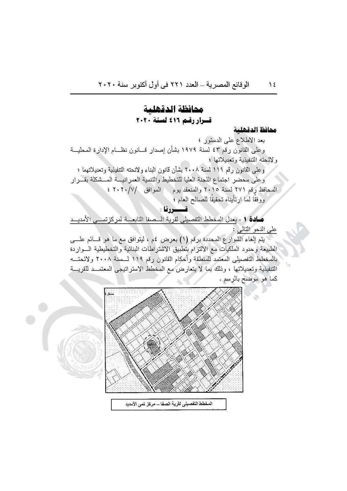 نشرت الجريدة الرسمية في عددها رقم 221، الصادر في 1 أكتوبر 2020، قرار محافظة الدقهلية رقـم 416 لسنة 2020، بشأن تعديل المخطط التفصيلي لقرية الصفا التابعة لمركز تمي الأمديد.