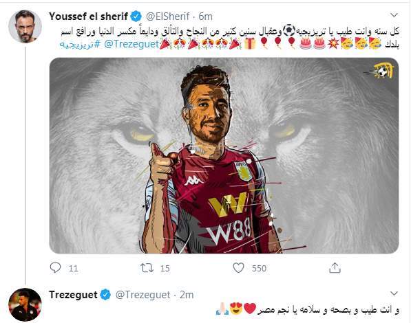 بعث الفنان يوسف الشريف رسالة تهنئة لمحمود حسن تريزيجيه، لاعب المنتخب ونادي أستون فيلا الإنجليزي، بعيد ميلاده الـ26، متمنيًا له التألق ورفع اسم مصر، وعلق تريزيجيه قائلًا: "وانت طيب وبصحة وسلامة يا نجم مصر "