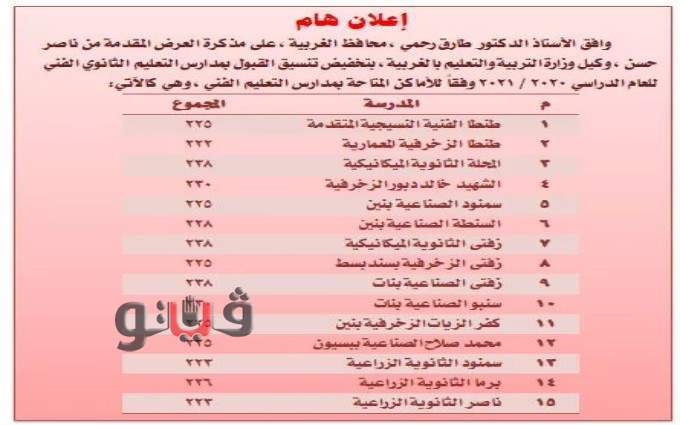 تخفيض تنسيق القبول بمدارس التعليم الفني إلى ٢٢٢ درجة في الغربية