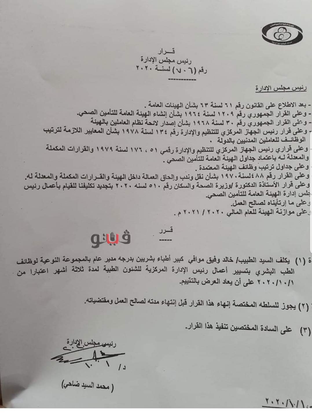 اصدر الدكتور محمد ضاحي رئيس هيئة التأمين الصحي قرار رقم ٧٠٦ لسنة ٢٠٢٠ بشأن تكليف الطبيب خالد موافي كبير اطباء بشريين درجة مدير عام بتسيير أعمال رئيس الإدارة المركزية للشئون الطبية لمدة ٣ شهور اعتبارا من ١ اكتوبر ٢٠٢٠