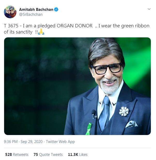 ونشر أميتاب باتشان صورة وهو يرتدي "الشريطة الخضراء"، معلقًا عليها: "أصبحت متبرع أعضاء.. أرتدي الوشاح الأخضر لقداسته".