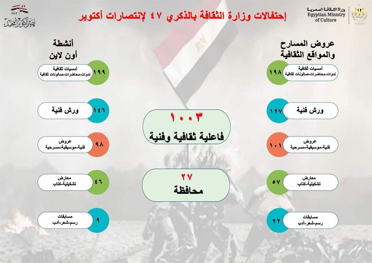 تنظم وزارة الثقافة 1003 فعالية فنية وفكرية في القاهرة والمحافظات بمختلف المواقع الثقافية احتفالا بالذكرى الـ 47 لانتصارات أكتوبر المجيدة ولأول مرة على قناة الوزارة باليوتيوب وكذلك المنصات الالكترونية التابعة للقطاعات على شبكة الانترنت .