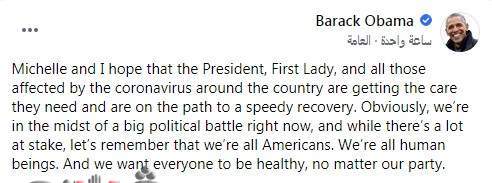 وكتب باراك أوباما على حسابه الشخصي بموقع التواصل الاجتماعي "فيس بوك": "أتمنى أنا وميشيل أن يحصل الرئيس والسيدة الأولى وجميع المصابين بفيروس كورونا في جميع أنحاء البلاد على الرعاية التي يحتاجون إليها وأن يكونوا في طريقهم إلى الشفاء العاجل".
