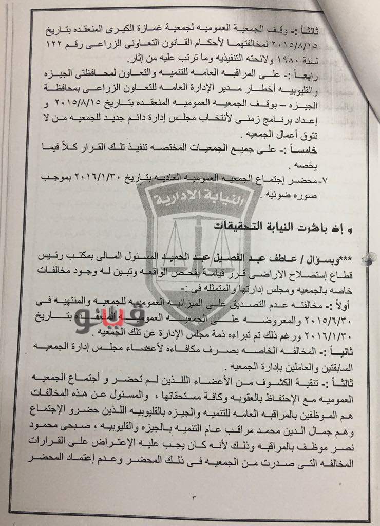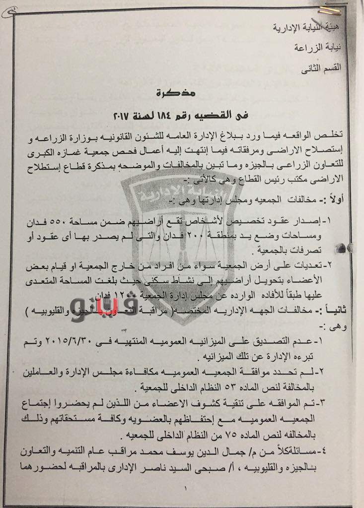وكانت النيابة الإدارية تلقت بلاغًا من الإدارة العامة للشئون القانونية بديوان عام وزارة الزراعة للتحقيق فيما انتهت إليه أعمال فحص جمعية غمازة الكبرى للتعاون الزراعي بالجيزة.