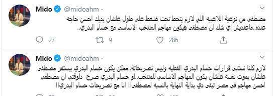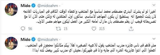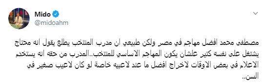 وكتب أمحمد حسام "ميدو" تغريدة على تويتر قال فيها: "مصطفى محمد افضل مهاجم في مصر ولكن طبيعي ان مدرب المنتخب يطلع يقول انه محتاج يشتغل على نفسه كتير علشان يكون المهاجم الاساسي للمنتخب..المدرب من حقه انه يستخدم الاعلام في بعض الاوقات لاخراج افضل ما عند لاعبيه خاصة لو كان لاعيب صغير في السن".