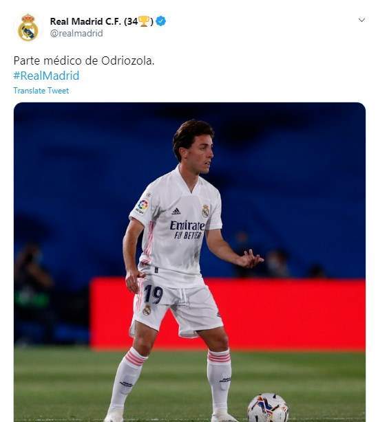 وكتب نادي ريال مدريد تغريدة على تويتر قال فيها: "بعد الفحوصات التي أجراها فريق الخدمات الطبية في ريال مدريد على لاعبنا ألفارو أودريوزولا ، تم تشخيصه بإصابته في ساقه اليسرى. في انتظار التقييم"