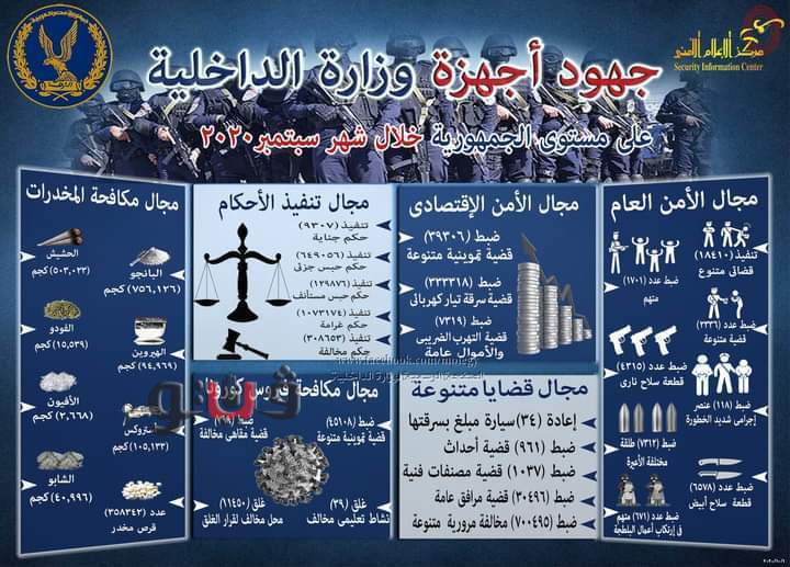 حملات أمنية مكبرة وجهتها أجهزة الأمن بوزارة الداخلية على مستوى الجمهورية لضبط كافة صور الخروج عن القانون وحائزى الاسلحة النارية والمواد المخدرة ومكافحة جرائم الإتجار وترويج المواد المخدرة، وتنفيذ الأحكام القضائية وإستهداف التشكيلات والبؤر الإجرامية ومواجهة الأنشطة غير المشروعة التى تؤثر على الإقتصاد القومى للبلاد.