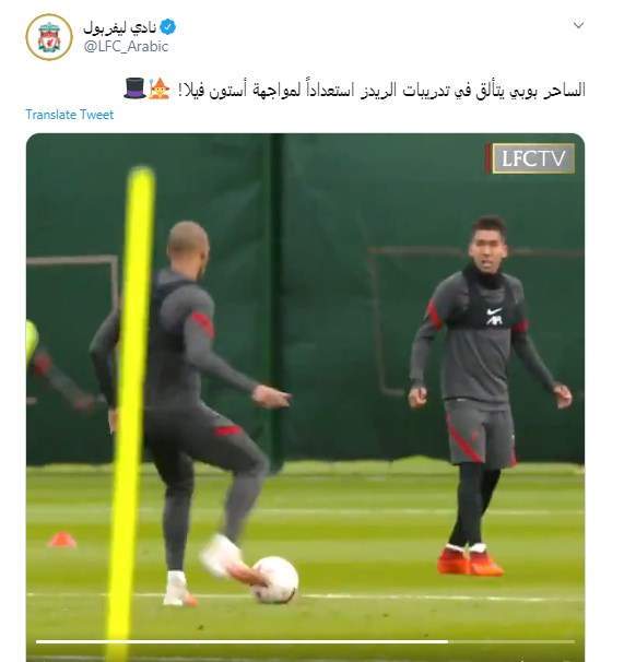 وكتب نادي ليفربول تغريدة على تويتر: "الساحر بوبي يتألق في تدريبات الريدز استعداداً لمواجهة أستون فيلا!"