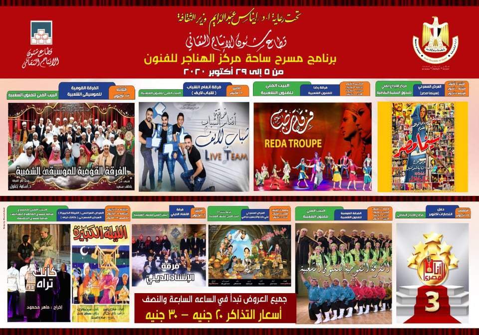تنطلق فعاليات برنامج قطاع شئون الإنتاج الثقافى برئاسة المخرج خالد جلال، فى الفترة من ٥ حتى ٢٩ أكتوبر الجارى، فى السابعة والنصف مساء يوميا على مسرح ساحة مركز الهناجر للفنون بدار الأوبرا المصرية.