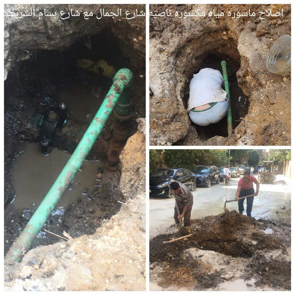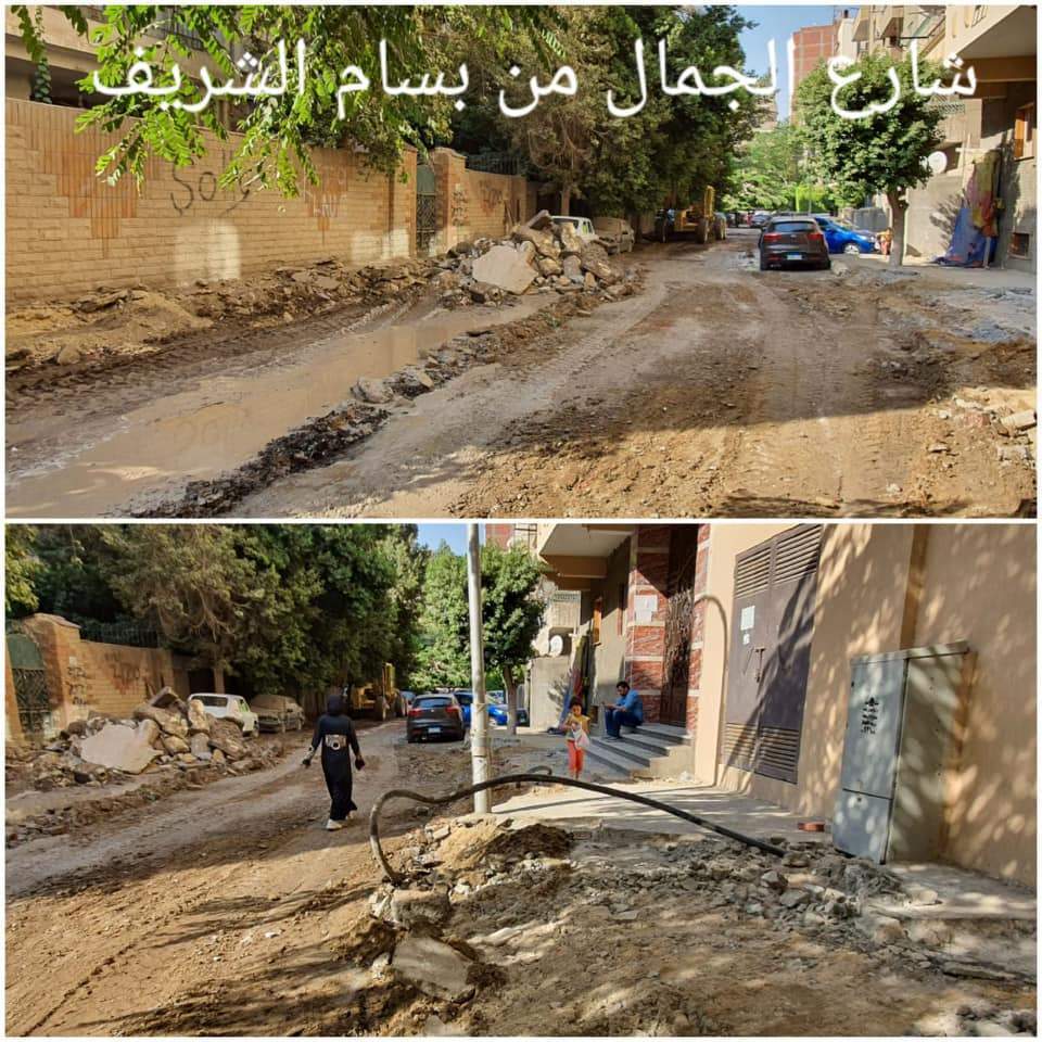 رصف الطرق وإصلاح ماسورة مياه مكسورة بشارع الجمال في الجيزة