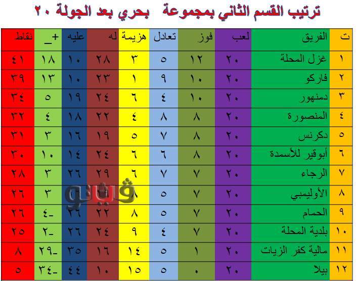 ويحتل غزل المحلة المركز الأول برصيد 41 نقطة ويليه فاركو في المركز الثاني برصيد 39 نقطة ثم دمنهور ثالثا برصيد 34 نقطة ثم المنصورة رابعا برصيد 32 نقطة.