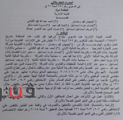 أصدرت المحكمة التأديبية العليا بمجلس الدولة حكمها بمجازاة رئيس القطاع القانوني ومديري التحقيقات والقضايا ومحاميان بشركة مصر للتجارة الخارجية بعد ثبوت إرتكابهم مخالفات مالية وإدارية وقانونية جسيمة ترتب عليها الإضرار بالمال العام.. وبراءة محاميتان لعدم صحة ما نسب اليهن.