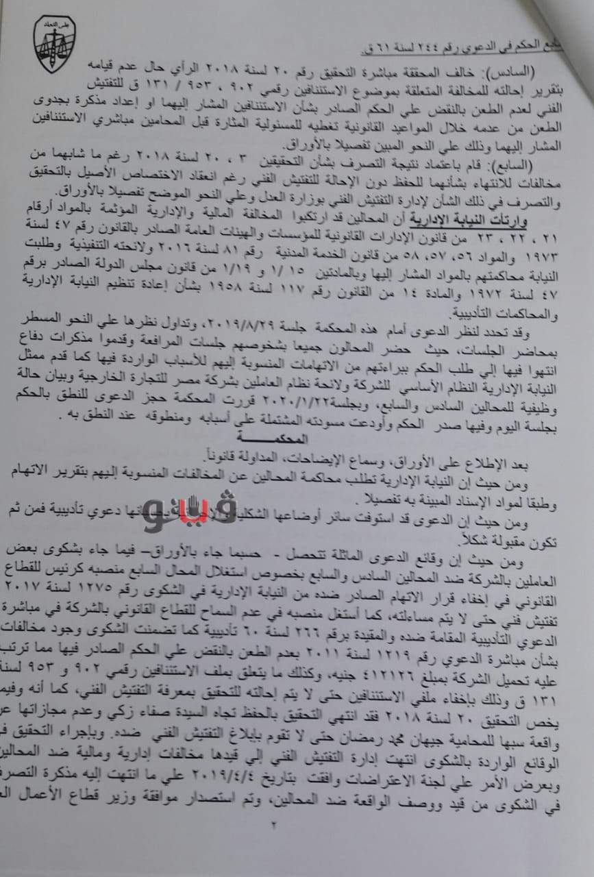 وقضت ايضا مجازاة شريف إسماعيل إسماعيل، مدير إدارة التحقيقات بالشركة بعقوبة اللوم لمخالفته رأي المحققة بشأن إحالة المخالفة المتعلقة بموضوع عدم الطعن على الإستئنافين أمام محكمة النقض تغطية للمسئولية المثارة في حق المحامين.