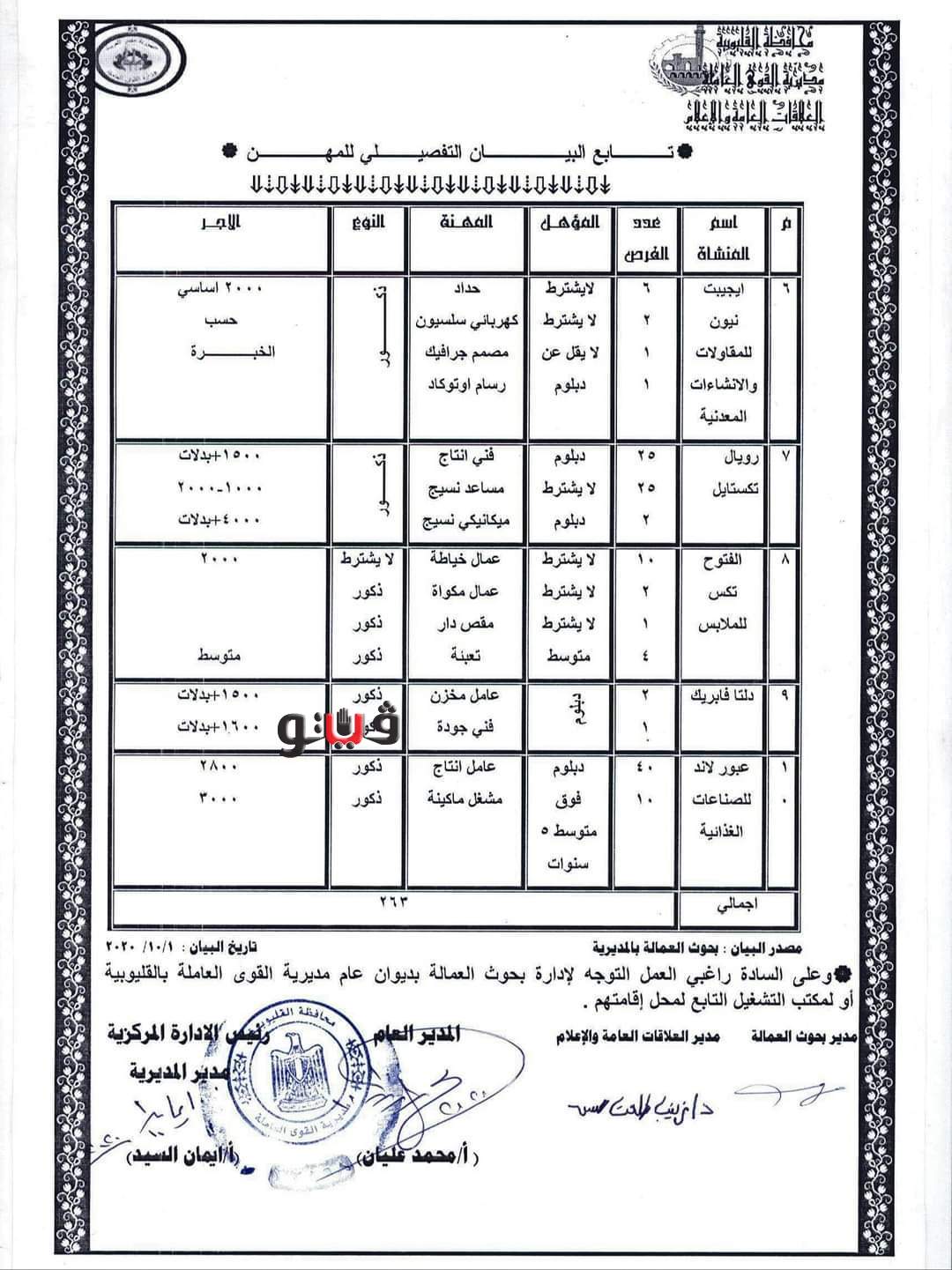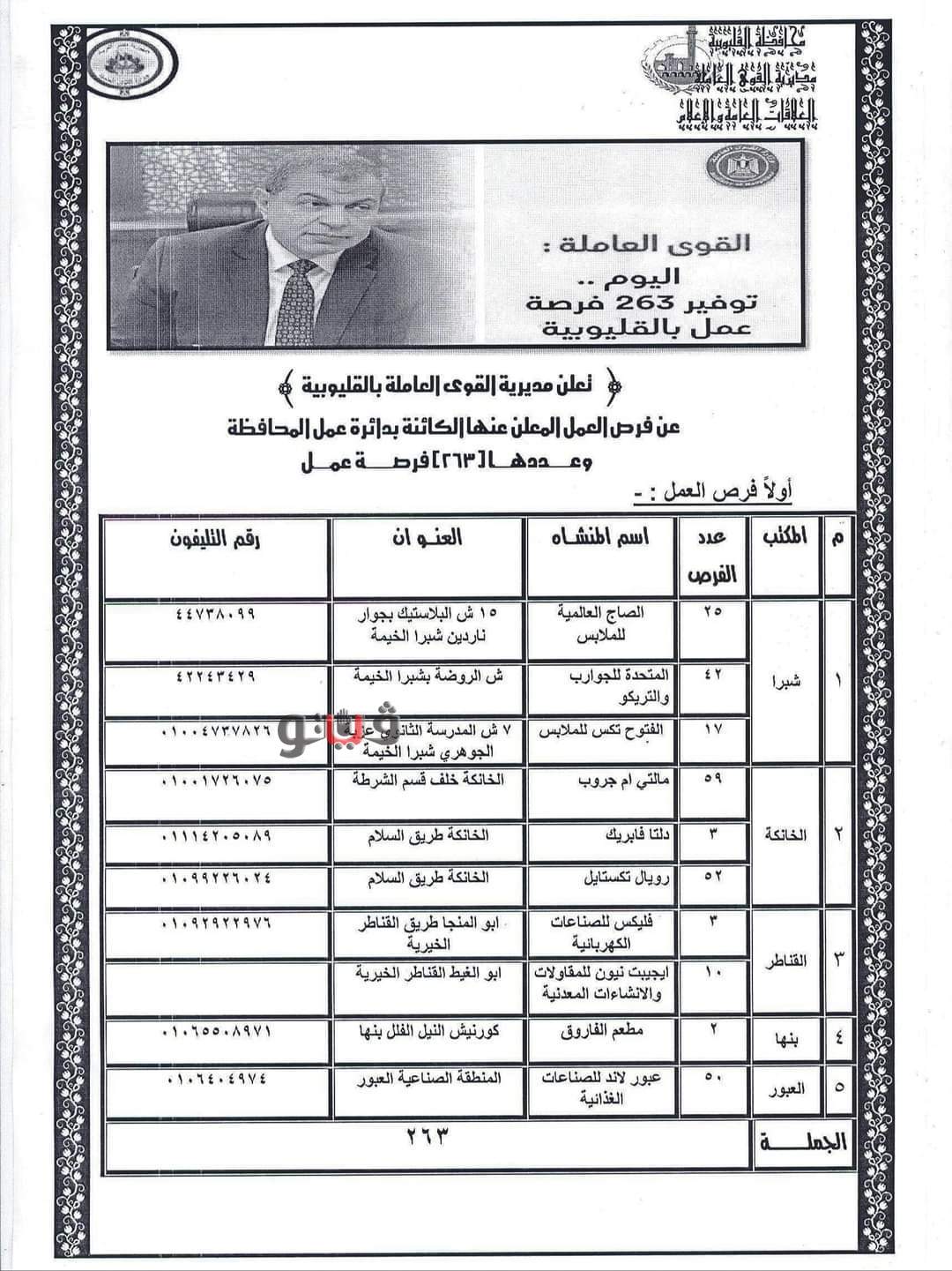 أعلنت مديرية القوى العاملة بالقليوبية عن نجاحها في توفير ٢٦٣ فرصة عمل لشباب المحافظة من أصحاب المؤهلات المتوسطة والحاصلين على مؤهلات عليا والشهادة الإعدادية وبدون مؤهل بالتعاون مع عدد من شركات القطاع الخاص.
