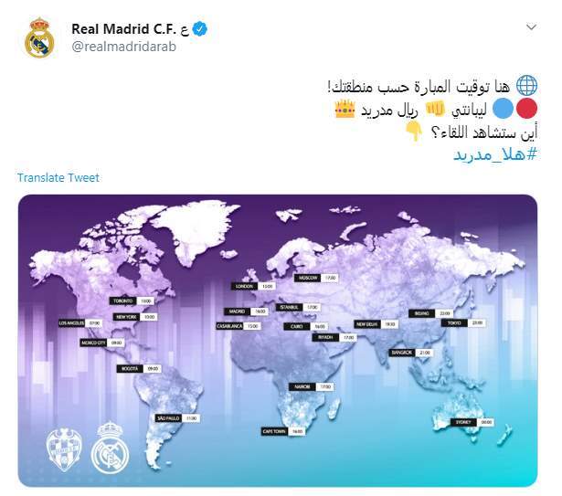 وكتب نادي ريال مدريد تغريدة على تويتر "هنا توقيت المبارة حسب منطقتك! ليبانتي ريال مدريد أين ستشاهد اللقاء؟ #هلا_مدريد"